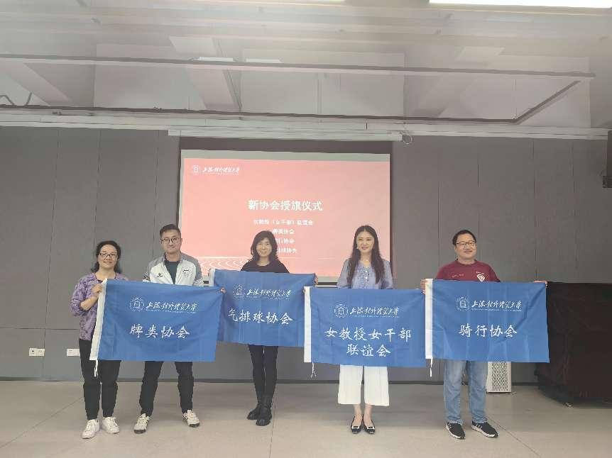 彭清清为新成立的协会授旗,从左到右依次分别是牌类协会、气排球协会、女教授(女干部)联谊会和骑行协会。