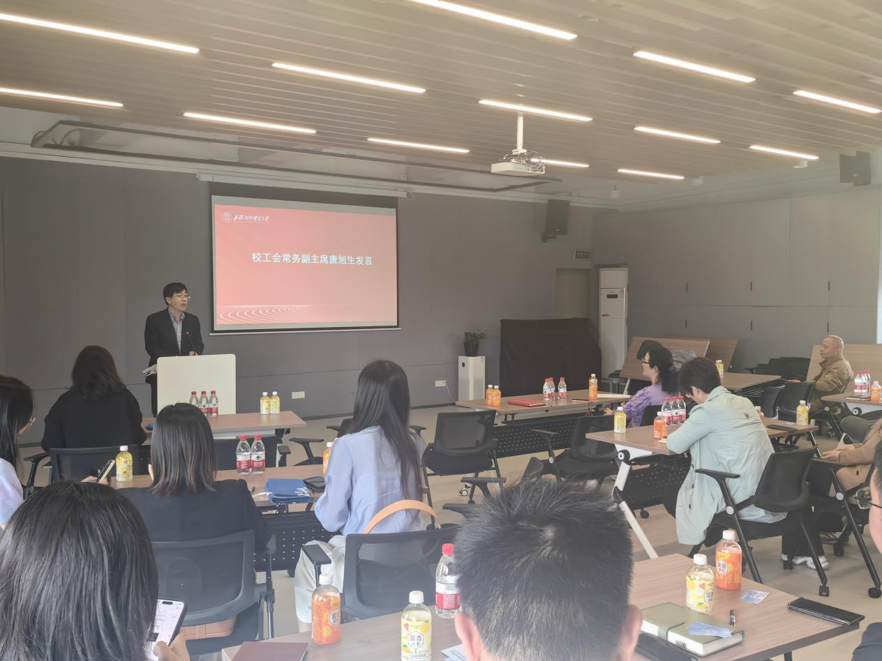 会上,校工会常务副主席唐旭生代表校工会致辞发表讲话,他首先对今天新成立的教工协会表示衷心祝贺,对今天受到表彰的优秀协会集体、优秀协会负责人和优秀协会积极分子表示衷心的祝贺。还表达了三个感谢:感谢各协会(社团)负责人和社团骨干老师对于社团成立建设所倾注的心血和汗水,感谢各社团(协会)在开展教工群众性文化体育活动方面做出的突出贡献,感谢学校各个部门、广大教职工对于教工社团协会发展所给予的大力支持。他代表工会表态,将不断完善制度,切实采取措施支持鼓励教工社团蓬勃发展。对全体协会工作者和积极分子表达了两个祝贺和三个感谢,对新社团、表彰协会和个人表示祝贺;并对接下来的教工协会工作从规范发展、创新发展、持续发展、融合发展等方面提出了建议,衷心希望各协会、社团要扩大宣传、完善组织队伍、灵活掌握时间、常态化开展活动,引导教职工以更加饱满的热情和强健的体魄迎接新的挑战,为推动学校高质量发展再上新台阶贡献力量。