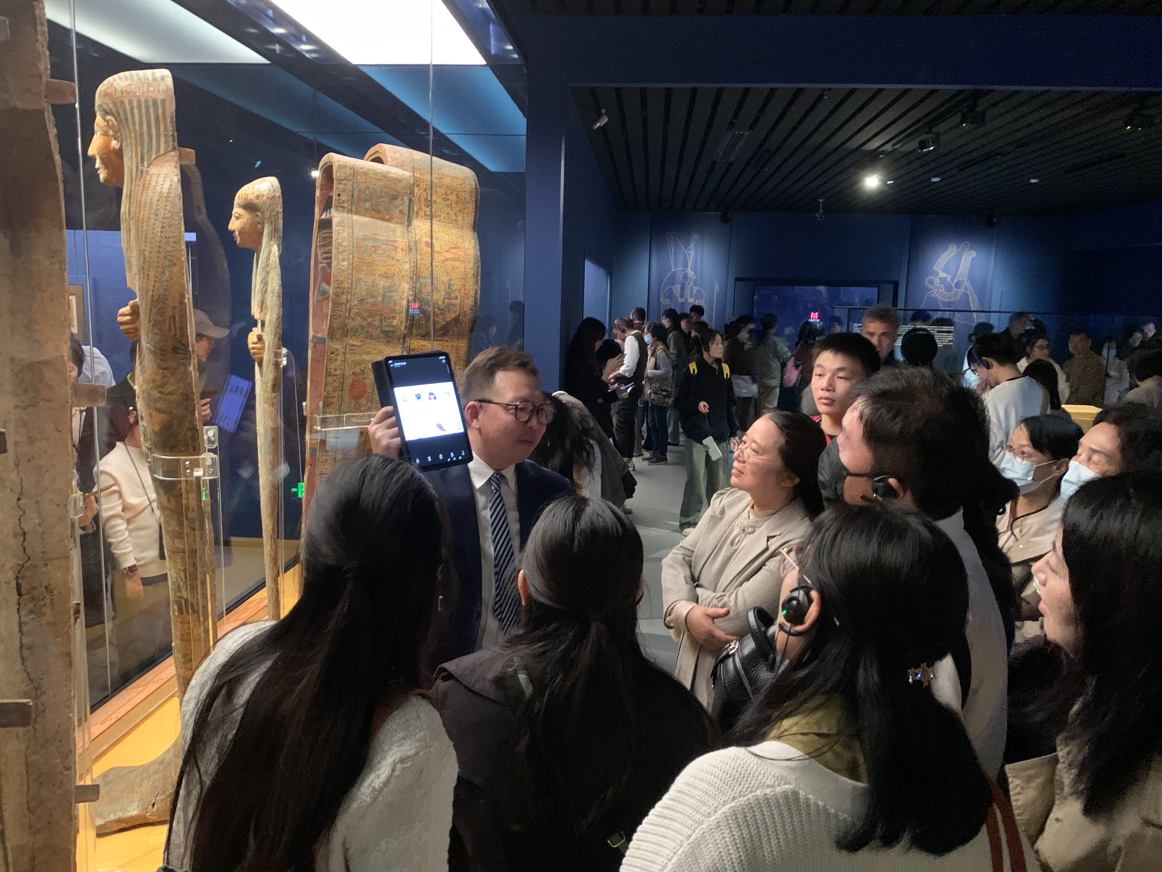 “法老的国度”展厅是此次展览的核心展区之一,一个展区,呈现了一部浓缩的古埃及文明史。展厅采用沉浸式设计,逼真复刻了古埃及哈布神庙的廊柱场景,老师们在这独特的设计中体验了古埃及历史发展脉络。其中,还探讨了古埃及文明和中华文明各自的发展脉络。