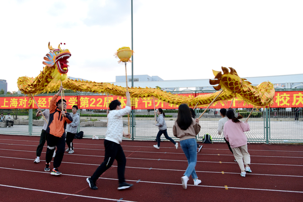 学生合唱团演唱《上海对外经贸大学校歌》,校舞龙队表演舞龙,由崔树林宣布第22届体育节开幕。