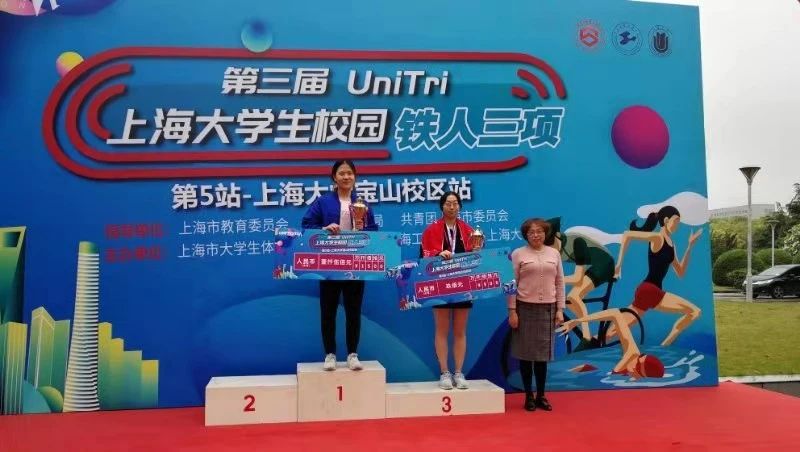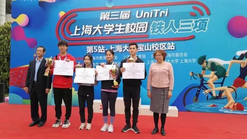 4月24日上午,第三届UniTRI上海市大学生校园铁人三项第5站比赛在上海大学宝山校区如期开赛,本次比赛由上海市教育委员会、上海市体育局、共青团上海市委员会指导,上海市大学生体育协会主办,上海工程技术大学、上海大学承办,共有来自全市15所高校的156名男女铁人参与了本次赛事的角逐。校园铁人三项比赛总距离为7.2公里,共包括0.2公里游泳、5公里自行车骑行以及2公里的跑步,此项运动对参赛选手的体能要求极高,我校体育健儿经过前期的努力训练,克服比赛时的阴雨不利参赛条件,奋勇拼搏,最终斩获女子组个人第三(王语蔚)和第四名(陈艺)以及男女混合团体三等奖的好成绩,充分展现了我校学生勇于挑战自我,不畏艰难的拼搏精神。