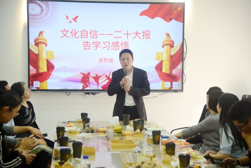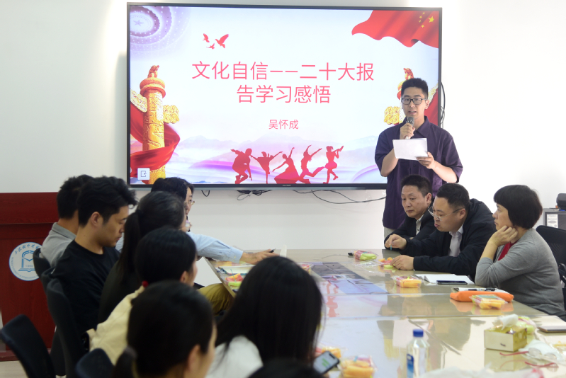 国际中文教育学院吴怀成副教授作了题为“文化自信与语言文字自信——党的二十大报告理论学习心得”宣讲,进一步深化了此次联组学习的理论内涵。他从语言学专业理论角度批驳了“语言优劣论”,并以充实的论据、生动的例证说明了汉语自有语法体系与中华民族文化历史、中国社会发展变迁之间的适洽性,阐释了汉语自在状态下所展现出的韵律之美、传情之效和载道之能,从而指出汉语可以讲好中国故事,汉语能够承载文化自信。吴怀成副教授引用了武汉大学沈壮海教授对“文化自信”的阐述,强调了文化自信既是每一个中国人的文化自信,也是中华民族的文化自信,更是立足当下的文化自信。吴怀成副教授指出,文化自信是应对世界多元文化冲突与碰撞的理性支撑、是提升国家文化软实力问题的观念前提、是实现文化大发展大繁荣及“中国梦”的内在张力。最后吴怀成副教授结合党的二十大报告对文化自信的阐述总结,我们不仅要对中国文化充满自信,而且也要对我们的语言文字充满自信,它自始至终在讲好中国故事和传承中华文化过程中都发挥着重要的作用,对我们的语言文字,既不要妄自尊大,更不要妄自菲薄。