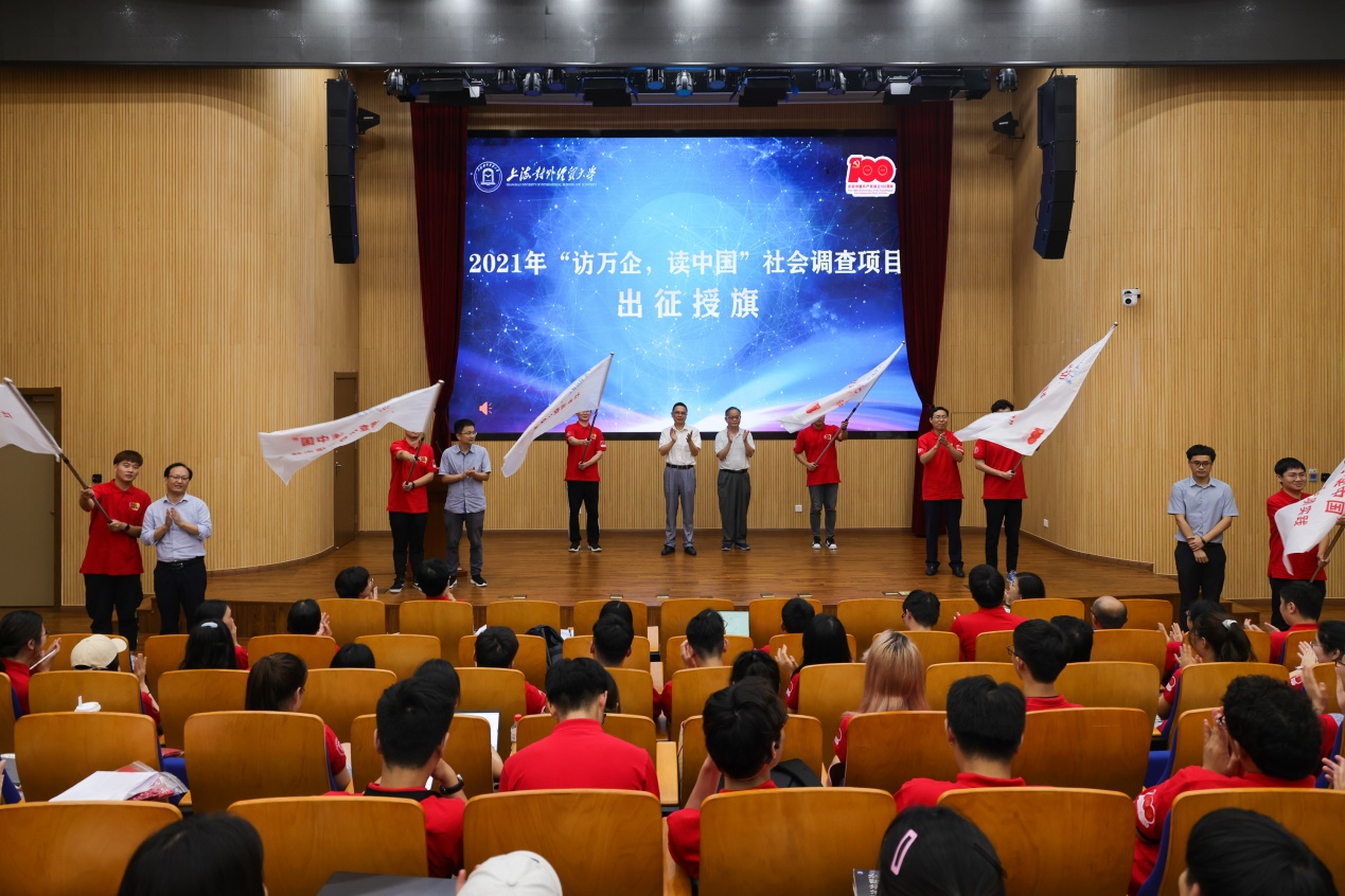 最后,与会领导为2021年“万企调查”项目队长代表授旗。徐永林宣布2021年上海对外经贸大学“访万企,读中国”调研队光荣出征。