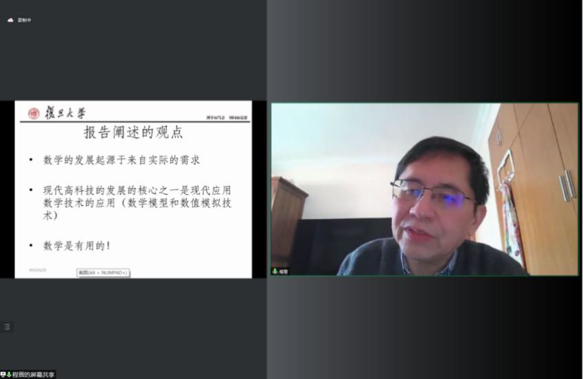 讲座中,程晋教授由浅入深地讲解了问题与反问题的概念与重要意义,通过其自身的相关经历为同学们阐明了数学模型和数值模拟技术在数学应用中的核心地位,将反问题由果求因的内涵直观地呈现在大家眼前,原本枯燥乏味的数学原理被讲解得简洁、生动。针对当下疫情,程教授也和同学们分享了近期的研究成果。在讲座中,程教授也不忘鼓励同学们在疫情期间也要努力学习,号召大家学好数学,打好扎实的数理基础。