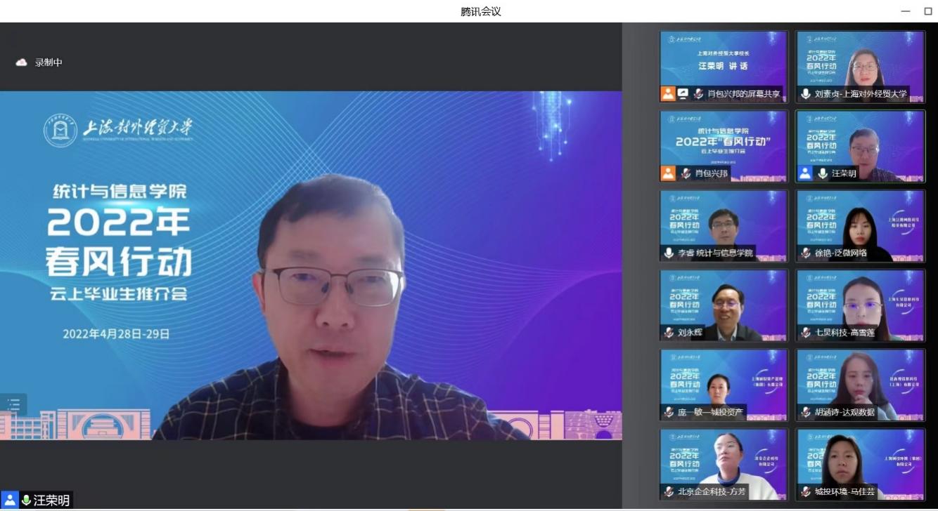 这是上海对外经贸大统计与信息学院推进实施的“春风行动”,为切实促进毕业生更充分、更高质量就业,积极搭建在校毕业生与用人单位精准供需对接的平台,于2022年4月起每周在线举办云上毕业生推介会。首场集中推介会于4月28日和29日两天滚动举行,吸引了埃森哲(中国)有限公司、上海投资咨询集团有限公司、上海泛微网络科技有限公司等15家用人单位,提供近60个就业岗位。25人初步达成了就业意向,约占招聘岗位的二分之一。