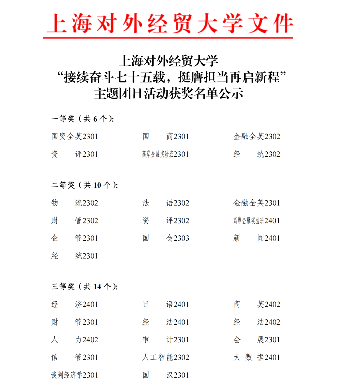 经院级推荐和校级评选,经统2302团支部获校级一等奖,经统2301团支部获校级二等奖,人工智能2302团支部、信管2301团支部和大数据2401团支部获校级三等奖。