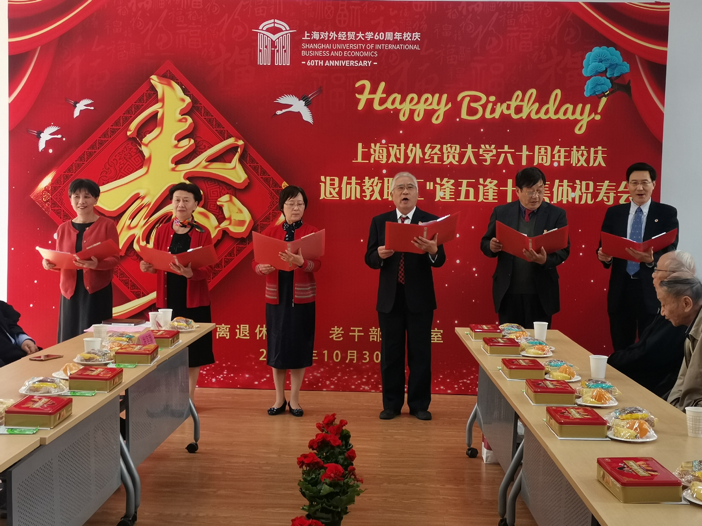 10月30日, 2020年退休教职工“逢五逢十”集体祝寿会在古北校区举行。校党委副书记、副校长祁明出席祝寿会,并代表学校党政领导班子向寿星们致以诚挚的祝福。2020年“逢五逢十”退休教职工有96位,54位出席祝寿会。本次祝寿会由离退休党委书记、老干部办公室主任董伊金主持。