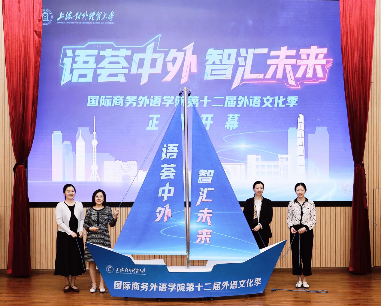 沈艺与现场领导嘉宾共同启动本届外语文化季,随着印有“语荟中外,智汇未来”的蔚蓝色风帆缓缓升起,国际商务外语学院第十二届外语文化季正式拉开序幕。