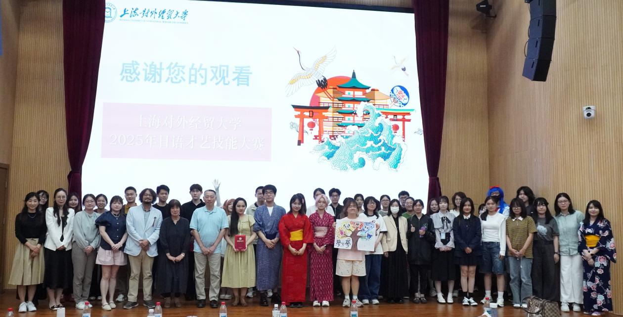 2025年上海对外经贸大学日语才艺技能大赛在热烈的掌声中圆满落幕。全体嘉宾、选手及工作人员合影留念,共同记录这一充满活力与成长的文化盛宴。