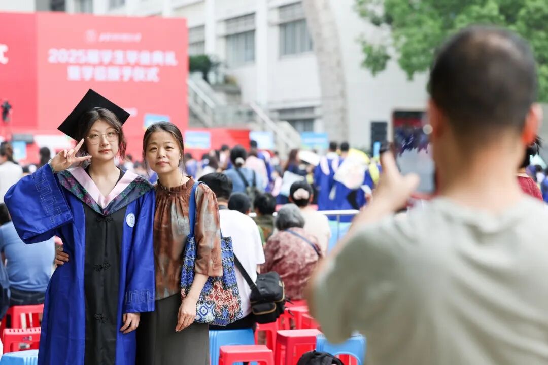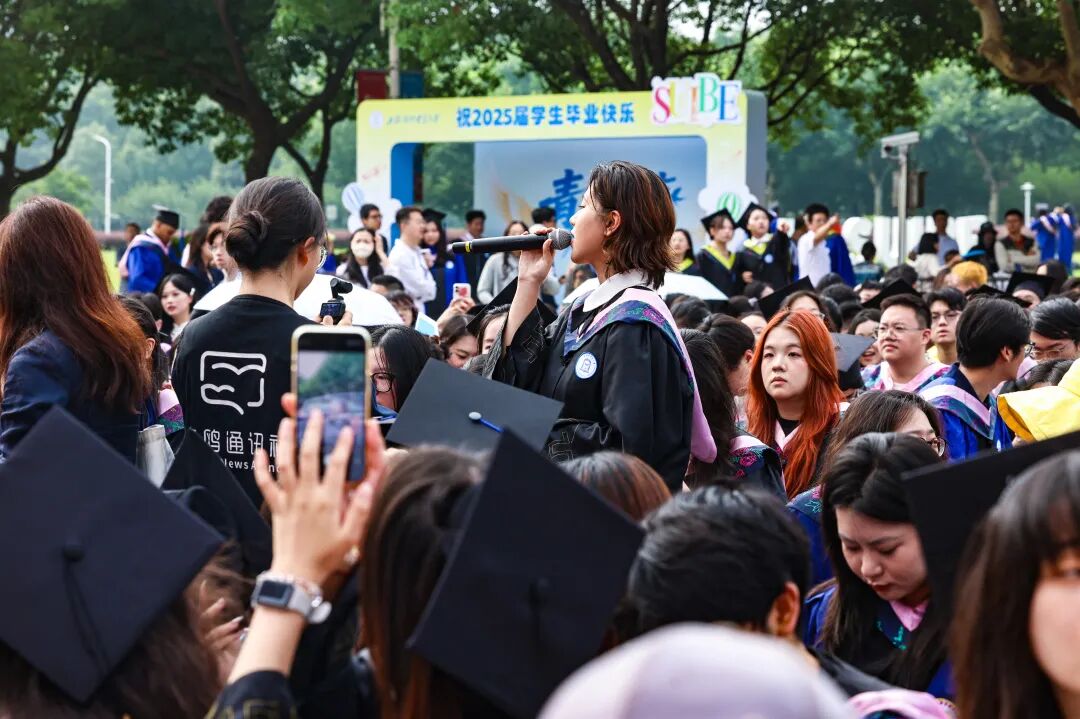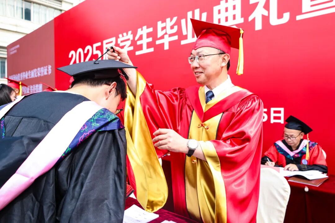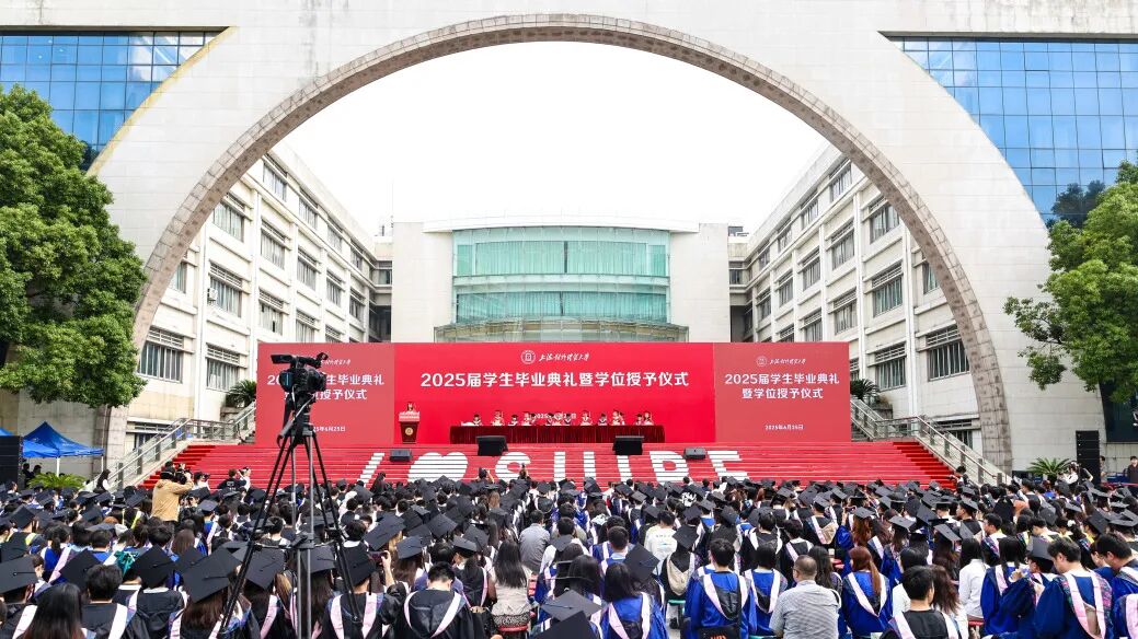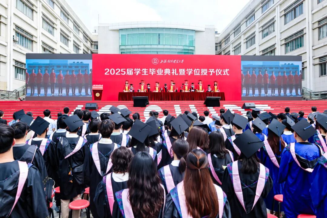 6月25日上午,学校2025届学生毕业典礼暨学位授予仪式在松江校区图文信息大楼南广场隆重举行。2025届全体毕业生与学校领导、老师和亲友们欢聚一堂、共襄盛会。