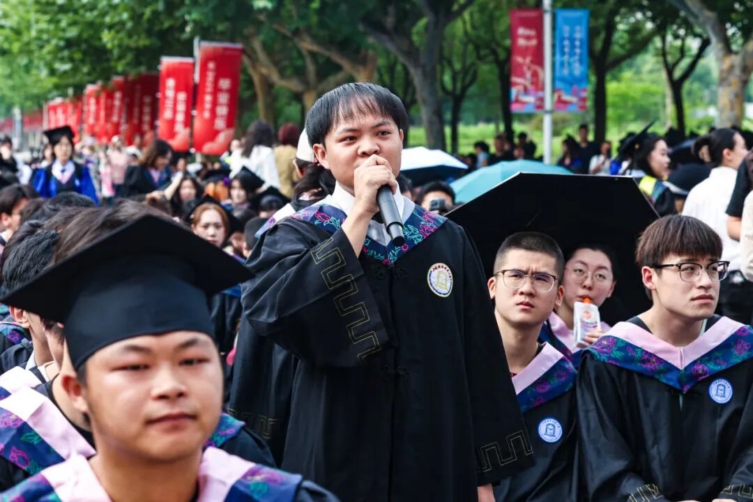 研究生毕业生代表工商管理学院马政在发言中回顾了申博的历程,感谢学校不仅让同学们汲取了系统的专业知识,更深刻领会了“经世济民”的担当,表示将带着在学校学到的知识、练就的本领和沉淀的品格,脚踏实地,勇毅前行,让书本上的知识在现实的土壤中扎根生长。