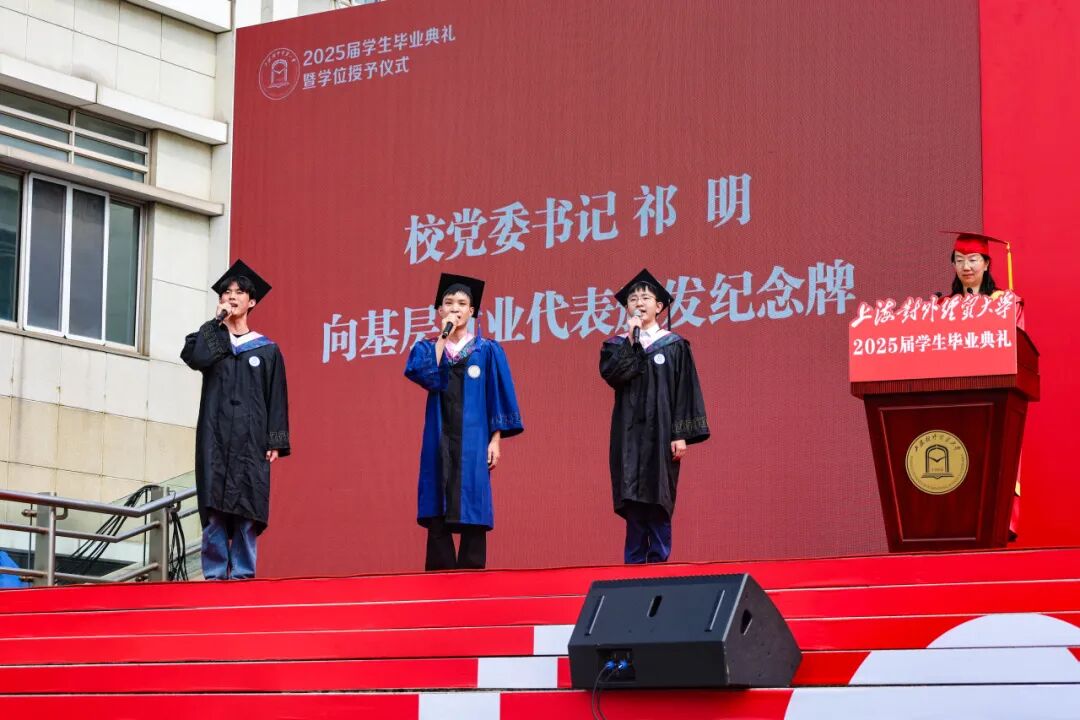 校党委书记祁明向基层就业代表颁发纪念牌。三位即将奔赴基层就业的毕业生代表向学校汇报毕业去向——法学院桂信仰即将成为西部计划志愿者奔赴新疆,国际商务外语学院刘复兴即将回家乡贵州省成为一名基层公务员,会展与传播学院陈富堂即将作为大学毕业生义务兵应征入伍。他们将奋发有为,挺膺担当,在广阔的基层天地中以苦干实干绽放属于自己的“青春之花”!
