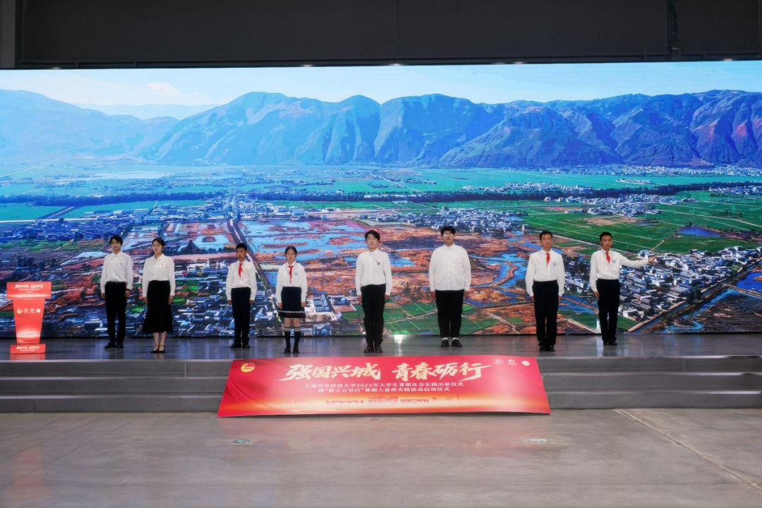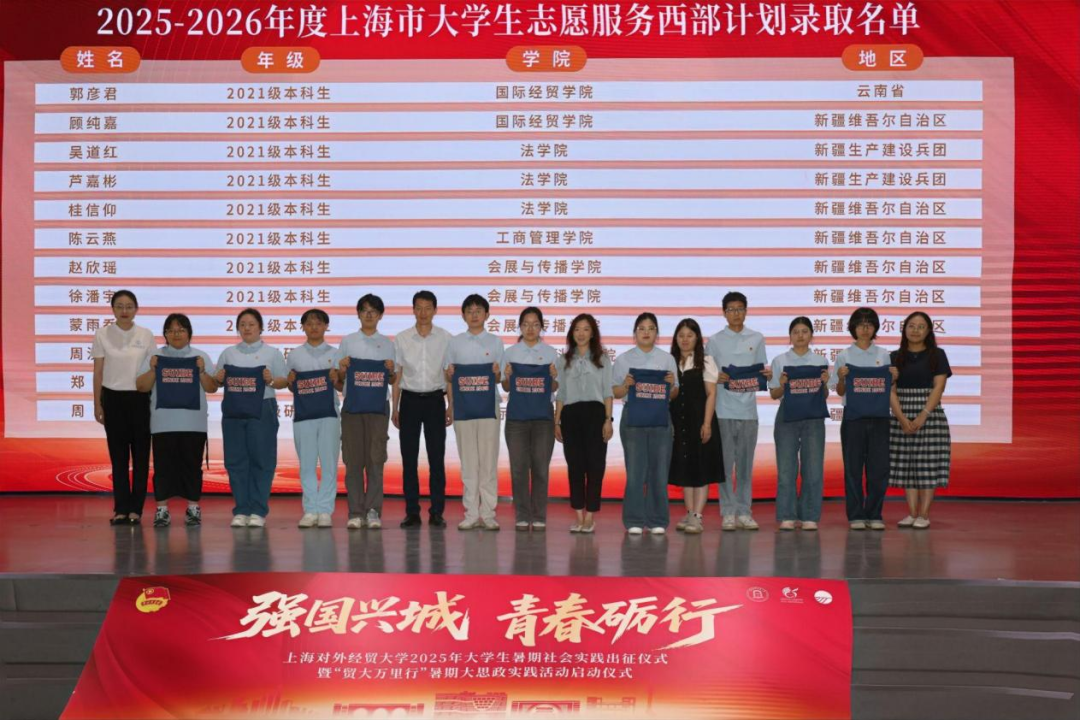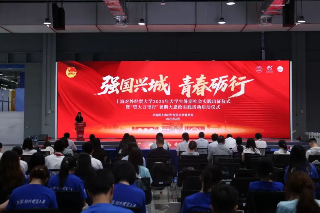 6月27日,上海对外经贸大学“强国兴城,青春砺行”2025年大学生暑期社会实践出征仪式暨“贸大万里行”暑期大思政实践活动启动仪式在虹桥品汇举行。校党委副书记、副校长沈艺,东方国际(集团)有限公司党委副书记薛继凤,团市委学校工作部部长葛银锋,虹桥品汇总经理蔡军,相关部门和各二级学院党组织、团组织负责人,实践团队师生代表等参加活动。会议由校团委书记司徒力云主持。