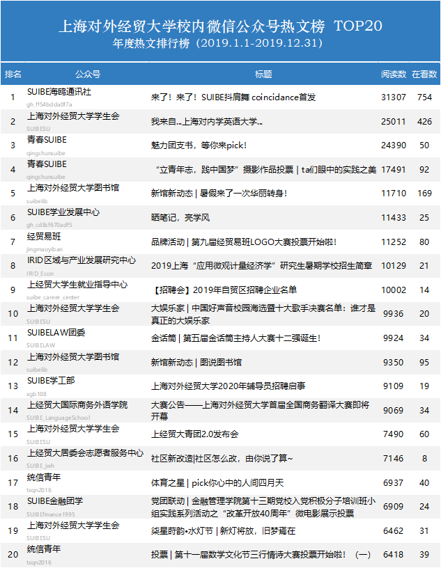 2019年度热文中,数量多为校园活动、投票评选等师生参与度比较高的内容,如《魅力团支书,等你来pick!》阅读量24390,《“立青年志,践中国梦”摄影作品投票|ta们眼中的实践之美》阅读量17491;其次展现我校学子风采的内容关注度也很高,如《晒笔记,亮学风》阅读量11433,《金话筒|第五届金话筒主持人大赛十二强诞生!》阅读量9924;和师生息息相关的校园热点也颇受关注,如《新馆新动态|暑假来了一次华丽转身!》阅读量11710,《社区新改造|社区怎么改,由你说了算~》阅读量7146;此外,利用视频、漫画等多种形式展现、且内容符合年轻人特征的创意专题比较受欢迎,如《来了!来了!SUIBE抖肩舞 coincidance首发》、《我来自...上海对内学英语大学...》,这两篇文章分别以阅读量31307和阅读量25011位居年度热文榜单前两名。