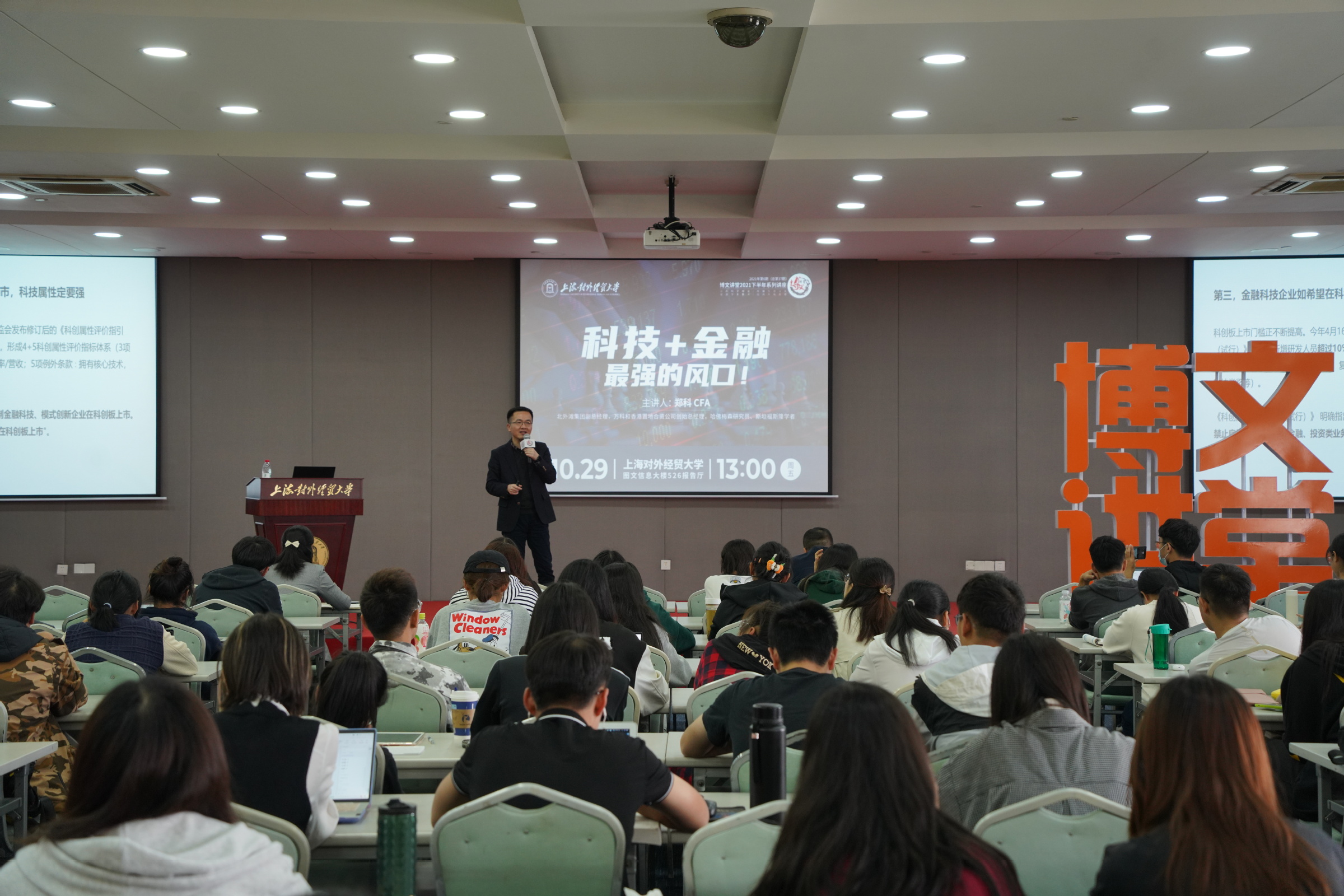 10月29日下午,学校2021年第六场博文讲堂在松江校区图文信息大楼526报告厅举行。本次活动由党委宣传部、文明办、学(研)工部、教务处和研究生院联合主办,邀请了北外滩集团副总经理、万科和香港置地合资公司创始总经理、哈佛梅森研究员和斯坦福斯隆学者郑科作题为“科技+金融,最强的风口”的专题讲座。100余名师生聆听了讲座。