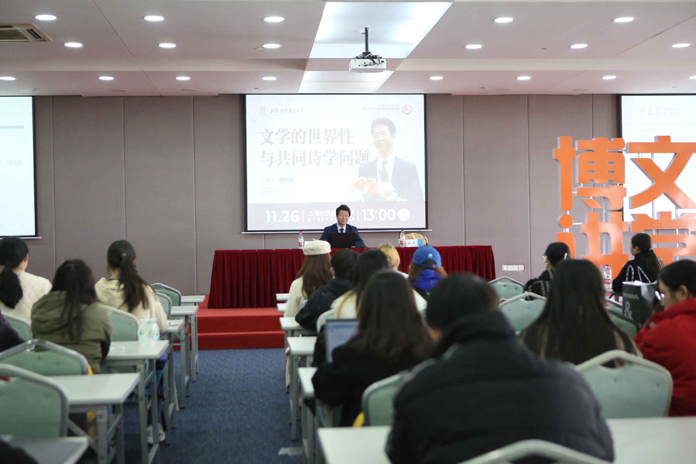 11月26日下午,学校2021年第七场博文讲堂在松江校区图文信息大楼526报告厅举行。本次活动由党委宣传部、文明办、学(研)工部、教务处和研究生院联合主办,邀请上海外国语大学党委常委、副校长、上海市外文学会会长、教授、博士生导师查明建作题为“文学的世界性与共同诗学问题”的专题讲座。本次博文讲堂由校党委宣传部部长郭茜主持。我校100余名师生聆听了讲座。
