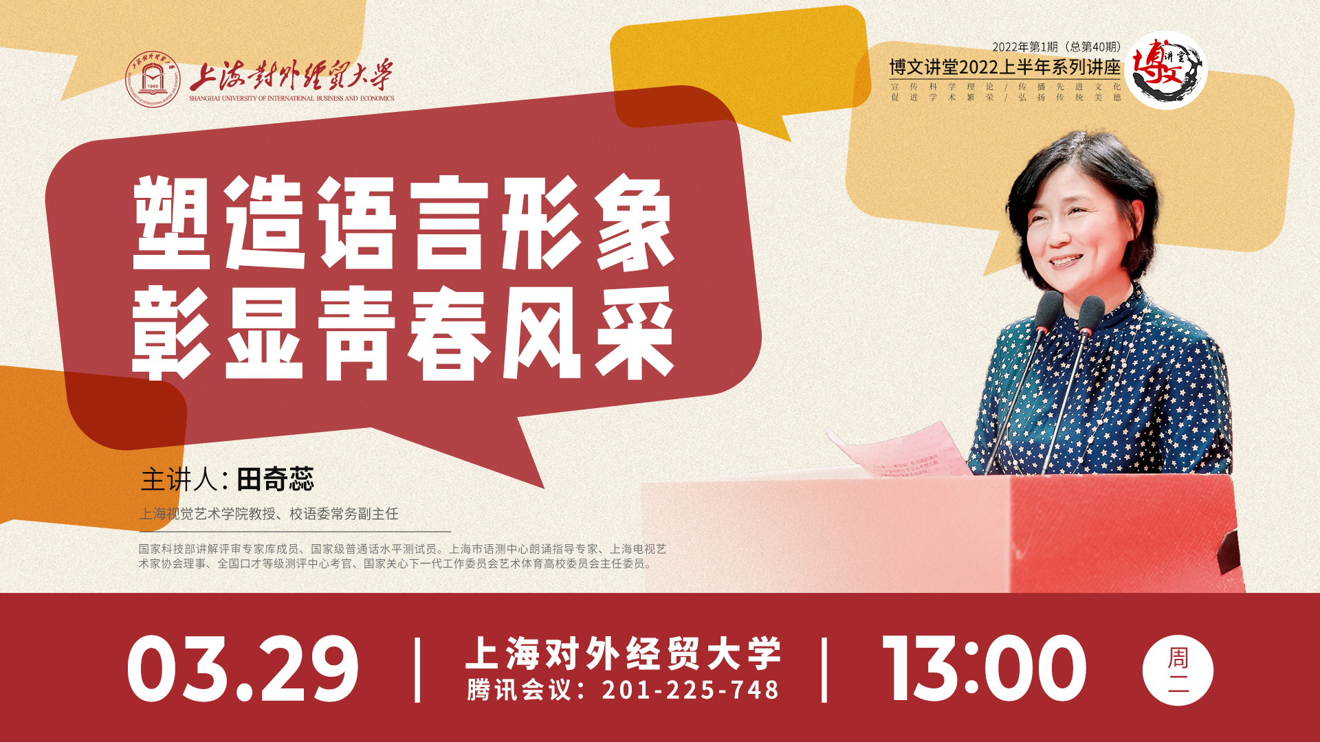 3月29日下午,学校2022年第一场博文讲堂在线上举行。本次活动由党委宣传部、文明办、学(研)工部、教务处和研究生院联合主办,邀请了上海视觉艺术学院田奇蕊教授作题为“塑造语言形象、彰显青春风采”的专题讲座。300多名学生在线上聆听。