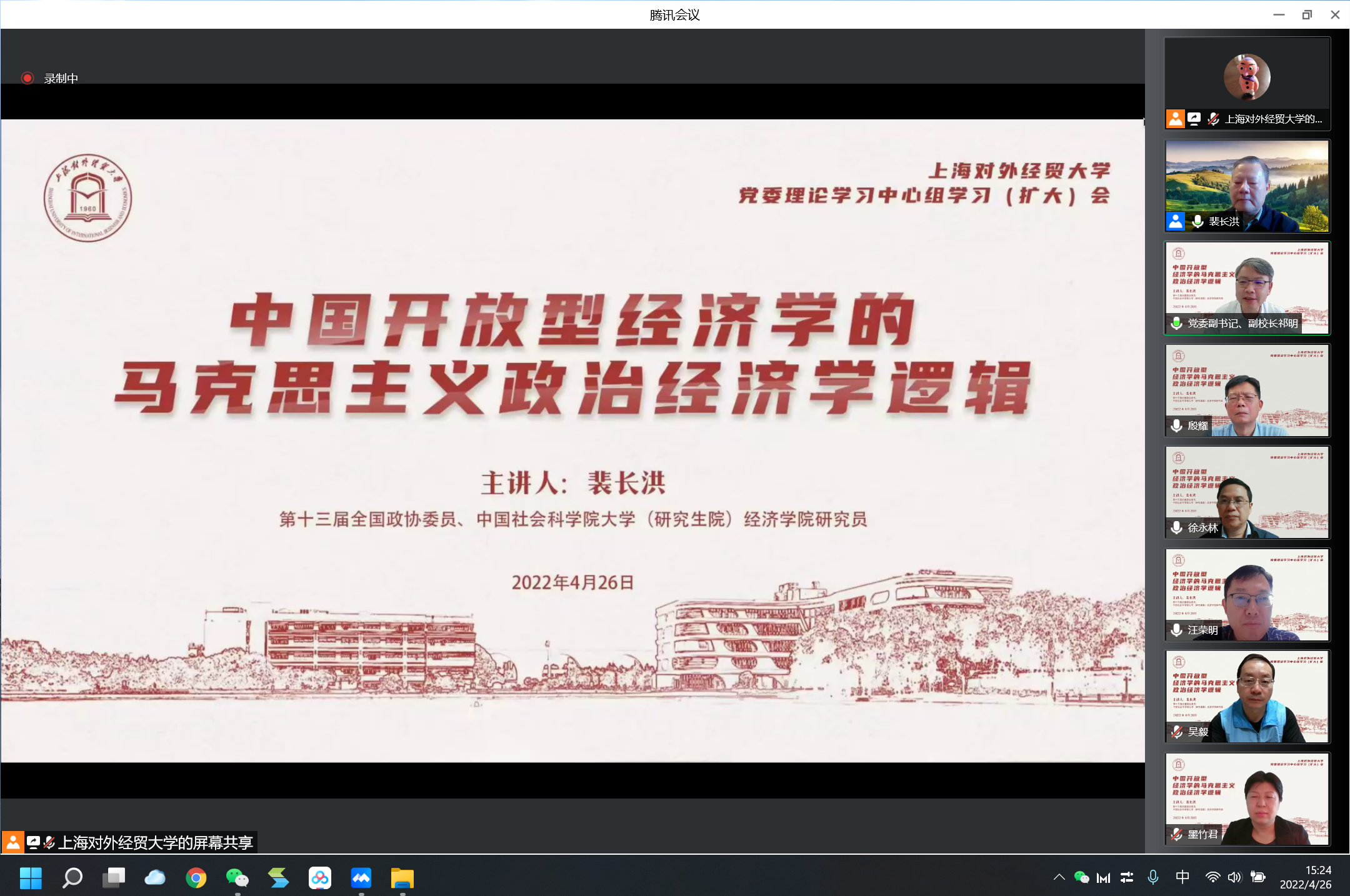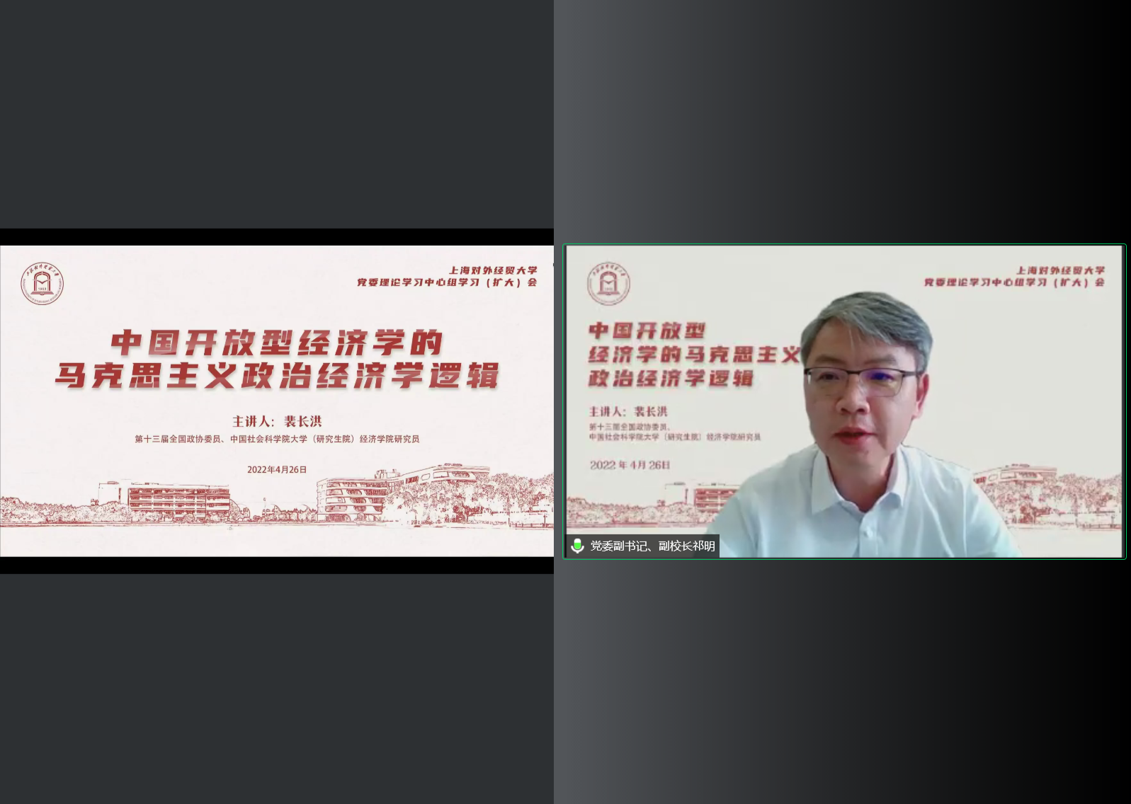 为了深入学习习近平新时代中国特色社会主义经济思想,准确把握习近平总书记关于世界百年未有之大变局、国内大循环为主体,国内国际双循环相互促进、构建人类命运共同体以及开放发展新理念等重要论述,426日下午,学校邀请第十三届全国政协委员、中国社会科学院大学(研究生院)经济学院裴长洪研究员作题为“中国开放型经济学的马克思主义政治经济学逻辑”的专题辅导报告。会议以线上方式举行,学校党委理论学习中心组成员,全体中层干部,教职工党支部书记,系(专业)主任,各民主党派、统战团体负责人参加学习会。会议由校党委副书记、副校长祁明主持。