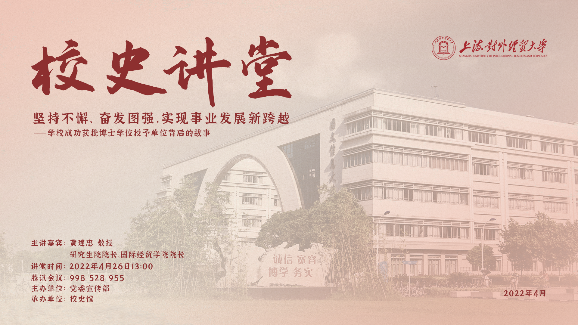 校史讲堂由党委宣传部主办,校史馆承办,旨在通过讲述、沙龙、研讨等多种方式,记录学校与国家贸易发展、上海城市发展的故事,讲述学校不同阶段的发展师生与学校共同成长的故事,以此来弘扬学校精神,推进文化传承本次讲堂为总第四讲,2022年第一讲