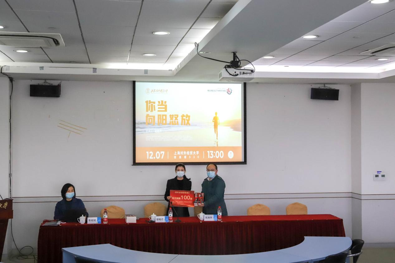 讲座开始前,梁晓芹向学校赠送100册个人著作《你当向阳怒放》,党委宣传部副部长陈颖辉代表学校接受赠书。