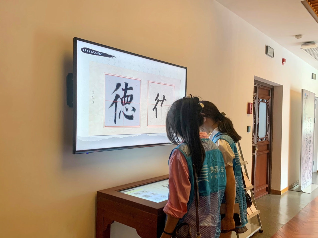 观展之余,留学生们也对书画互动体验和绘画印章饶有兴致,在互动一体机上一笔一划临摹书法作品并得到即时点评,让大家兴奋不已;通过屏幕引导,遵循国画“勾、皴、点”的创作步骤,完成一幅自己的国画作品,大家成就感满满;打卡收集名家书画印章并互相比对,乐趣无穷。师生们漫步于醉白池公园,欣赏着具有明清江南园林风貌的景观。一泓池水为中心,环池三面曲廊亭榭,晴雨皆可凭栏赏景,回廊曲径,步移景异,“春访牡丹夏观荷、秋来赏菊冬瞻梅”的趣味让大家流连忘返。