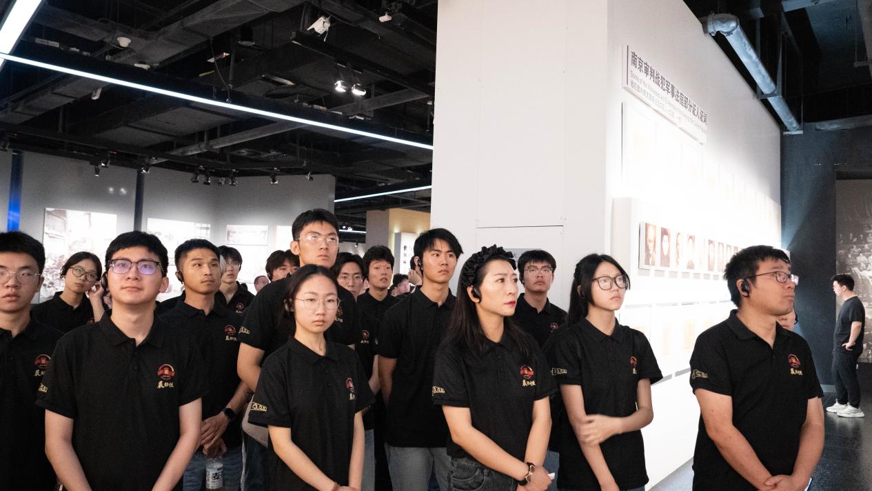 师生们在讲解员的带领下参观南京大屠杀史实展。在“人类的浩劫”展厅,长达126米的遇难者档案墙震撼人心,4000余份原始档案、1200张历史照片系统还原1937年的黑暗岁月。大家驻足于历史动态影像前,通过幸存者夏淑琴老人证言视频,直观感受“12秒水滴”装置——它象征着每12秒就有一个生命消逝。从史料陈列厅转入“正义必胜,和平必胜,人民必胜”专题展厅,青铜主题墙上镌刻的宣言在射灯下熠熠生辉,毛泽东主席“庆祝抗日战争胜利,中华民族解放万岁”的金色大字光彩夺目。“正义的审判”展区墙面上,远东军事国际法庭检察组人员照片中,裘劭恒正义凛然,目光如炬。陈列柜里,裘劭恒在远东军事国际法庭期间亲历东京审判的情况说明以及参加香港基本法起草的相关材料原件以醒目又饱含温度的形式呈现在眼前。在剧中饰演伍长德的国际经贸学院余天一同学写下这样的体会:“光明终会驱散黑暗,黎明的曙光总会到来。正如裘劭恒先生同国内外法官检察官,努力争取我们的权益,将战争罪犯绳之以法。‘有一个算一个,一个也逃不掉’的台词反复萦绕在我耳边,令我激动澎湃。”