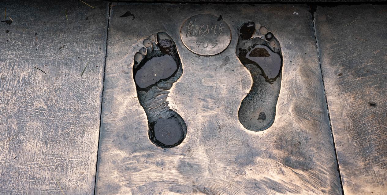 松柏青翠,灰白色的纪念馆建筑群更显庄重,剧组师生沿青铜浮墙缓步前行。在祭奠广场“灾难之墙”和刻有“遇难者300000”的纪念碑前,全体师生肃立默哀。伴随着低沉的哀乐,仪仗队步履铿锵,将写有“上海对外经贸大学2025年大师剧《裘劭恒》剧组敬挽”的花圈缓缓敬献于纪念碑前。师生在“历史证人的脚印”铜板路上的裘劭恒脚印前长久驻足。作为东京审判中国代表团助理检察官,裘劭恒1946年两次赶赴南京搜集日军南京大屠杀证据,带领十几位证人赴东京出庭作证,说服溥仪出庭作证,成为控诉日军暴行的铁证。触摸这些凹凸的印记,仿佛听见他用法律捍卫民族尊严的铿锵之音。