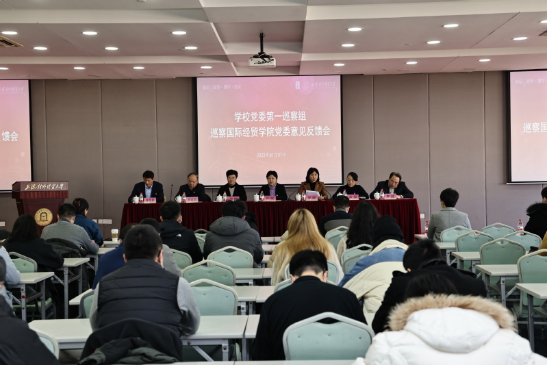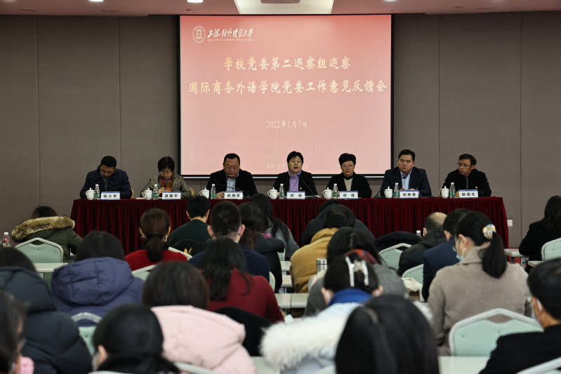 2022年1月7日,学校召开中共上海对外经贸大学第一届委员会第一轮校内巡察反馈会议。学校党委副书记、纪委书记、监察专员、党委巡察工作领导小组副组长许玫出席会议并讲话。巡察办主任,巡察组全体成员,被巡察单位领导班子、教职员工和学生代表参加了会议。
