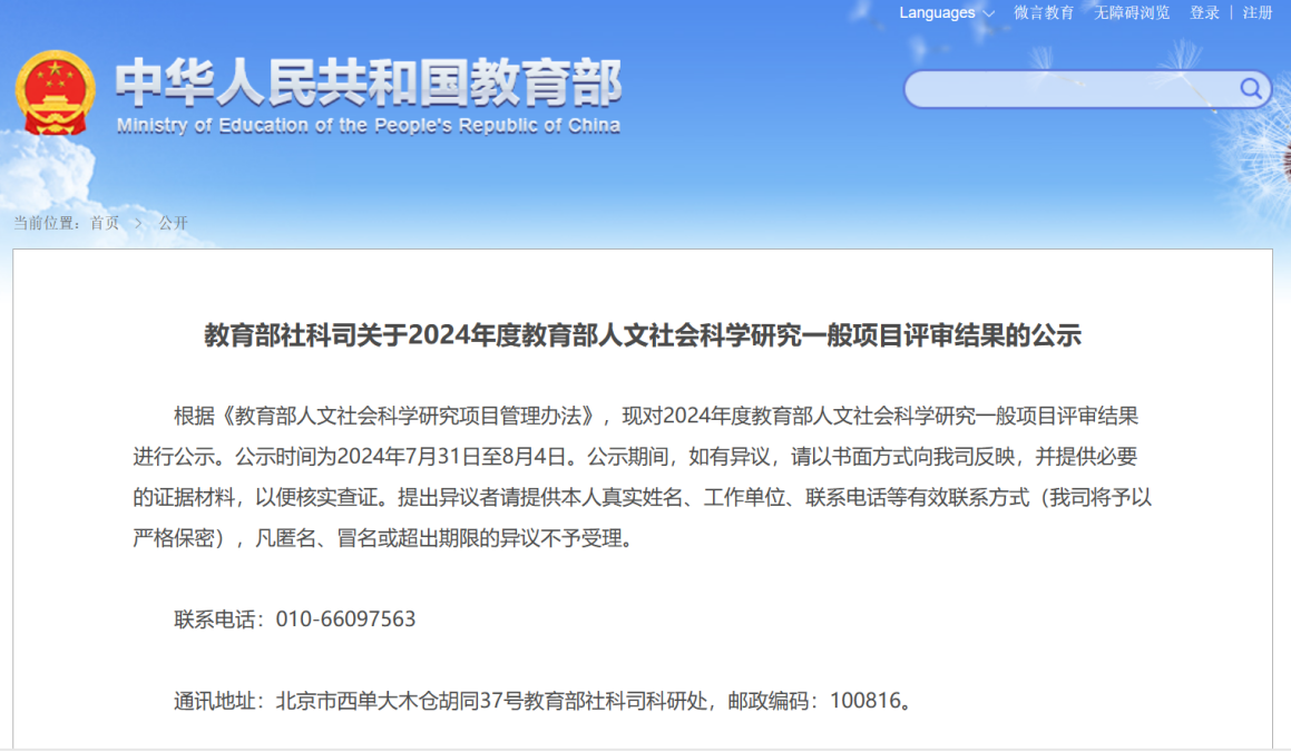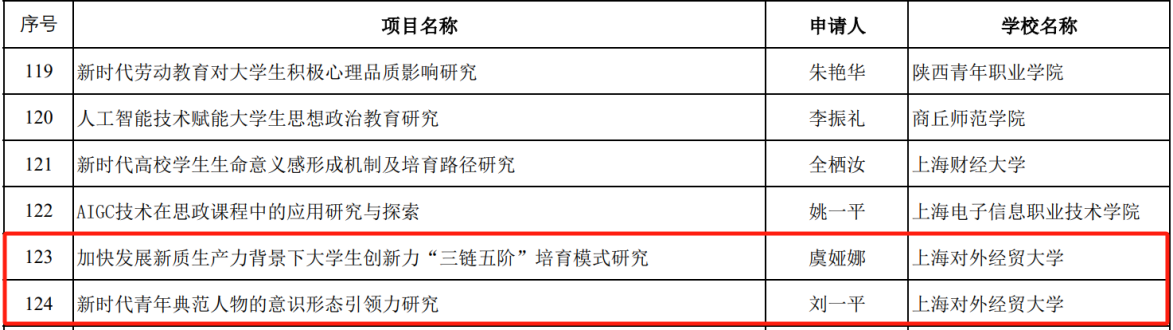 近日,2024年度教育部人文社会科学研究专项任务项目(高校辅导员研究)评审结果公示,我校国际中文教育学院党总支副书记虞娅娜主持的研究课题《加快发展新质生产力背景下大学生创新力“三链五阶”培育模式研究》和金融管理学院辅导员刘一平主持的研究课题《新时代青年典范人物的意识形态引领力研究》均获立项。值得一提的是,我校辅导员已连续三年获批教育部辅导员专项,也是推荐申报的辅导员专项(限报2项)全部获得立项的首次突破!