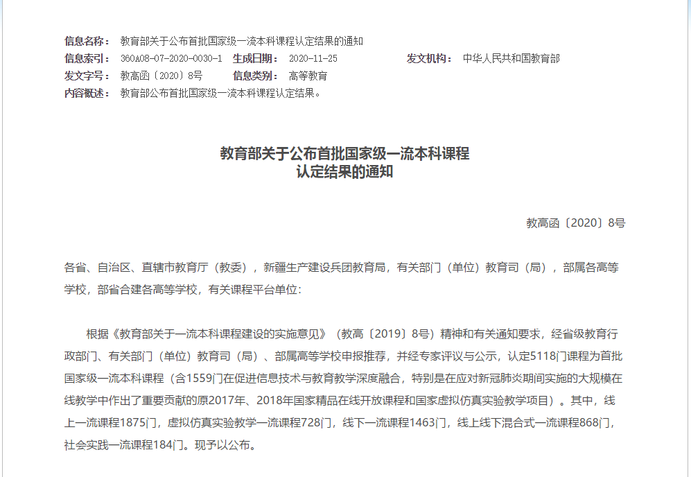 此次教育部首批认定了5118门国家级一流本科课程,其中线上一流课程1875门,虚拟仿真实验教学一流课程728门,线下一流课程1463门,线上线下混合式一流课程868门,社会实践一流课程184门。教育部2019年出台《教育部关于一流本科课程建设的实施意见》(教高〔20198号),启动一流本科课程“双万计划”,经过三年左右时间,建成万门左右国家级和万门左右省级一流本科课程,推进本科课程“质量革命”。