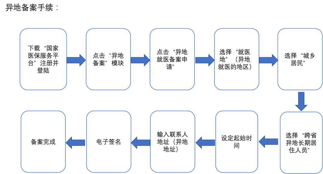 答:2023年1月1日起,可通过“国家医保服务平台”APP自助办理异地备案手续。具体路径:下载“国家医保服务平台”APP-热门服务-异地就医-自助开通,根据提示完成异地就医备案手续。办理成功后,异地备案立即生效。