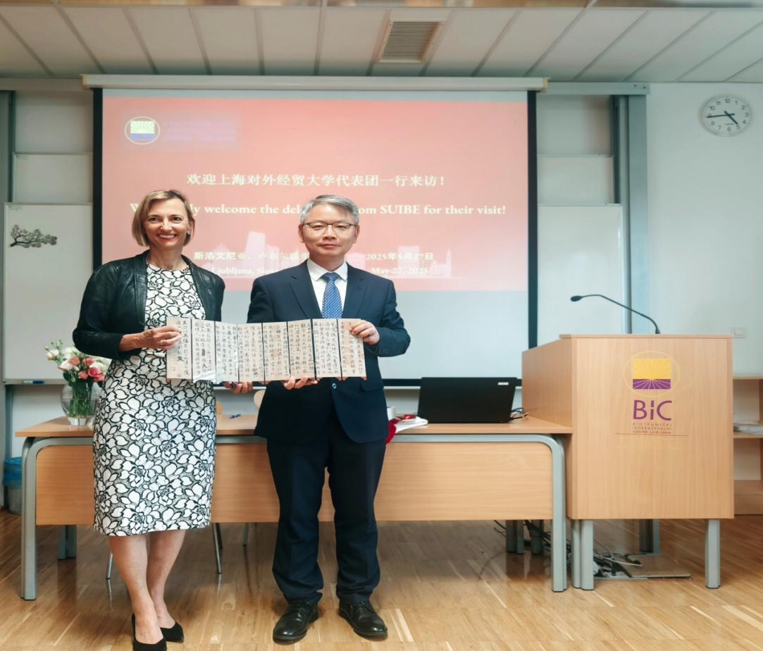 5月28日上午,代表团走访了卢布尔雅那大学经济学院,与院长Tomaz Turk教授、副院长Mateja Drnovsek教授等进行了座谈。Tomaz Turk院长对代表团来访表示热烈欢迎,并回顾了两校长期合作以及他本人上次走访我校的美好经历,希望在共同建设好卢大孔院的基础上,开展更多合作。祁明对经济学院历任院长给予卢大孔院以及相关合作的重视和支持表示感谢,并介绍了我校尤其是经济管理学科的最新发展、“新四通人才”培养特色、留学生工作、创新创业教育、国际化办学等情况。希望双方加大对卢大孔院的支持,并不断扩大共识,将信息科学、人工智能、大数据等学科赋能传统经济管理学科专业的升级改造,以培养高质量经济管理人才。座谈会期间,祁明还向Tomaz Turk院长转赠了中国国际中文教育基金会颁发的“孔子学院品牌授权书”。外事处副处长张水辉代表外事处与Tomaz Turk院长一起续签了相关学生交流交换协议。