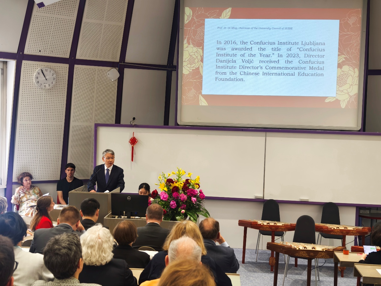座谈会结束后,代表团前往卢布尔雅那大学经济学院报告厅,与中国驻斯洛文尼亚大使馆临时代办赵炳辉、经济学院院长Tomaz Turk教授,以及中斯两国教育界、商界和文化界的百余位嘉宾共同出席了卢大孔院成立15周年庆典。祁明在致辞中表示,卢大孔院成立以来,在上级部门的关心和支持下,在中外两校的重视下,立足当地,积极推广中文教学和中国文化,为推动校际合作、中斯两国人文教育及经贸交流作出了重要贡献,受到社会各界的充分肯定。希望卢大孔院坚持办学特色,继续努力奋斗,为促进校际合作、增进两国民间友谊做出更大成绩。