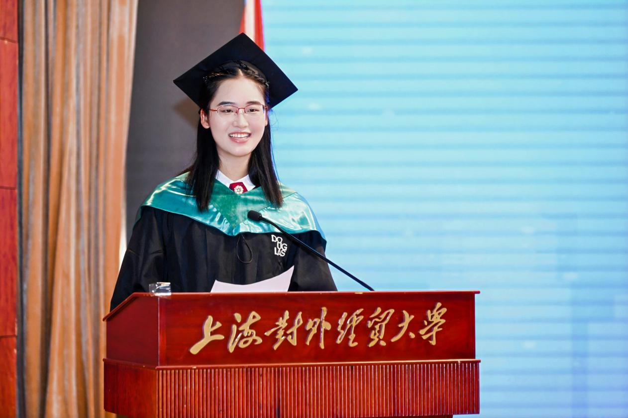 毕业生代表钱思蒙回顾了自己大学四年的成长历程,向母校、父母、朋友致以最诚挚的感激,也对于辛勤培育学生成长的中外教师表达真诚的敬意。她表示,站在人生的新起点上,毕业生们既要回望过去更应展望未来的广阔天地,希望同学们带着满满的收获和美好回忆,主动拥抱困难和挑战,开启人生新的征程。