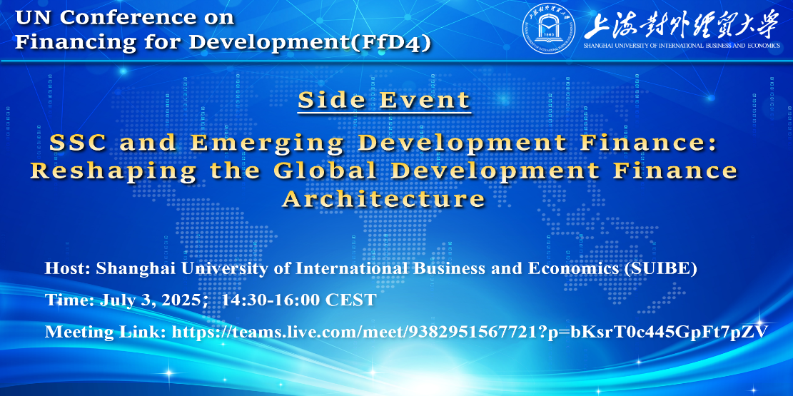 在此重要契机下,上海对外经贸大学作为中国在国际发展融资理论与政策研究领域具有重要地位的高校之一,受邀在FFD4大会官方框架内主办高级别边会,会议主题为:“南南合作与新兴发展融资:重塑全球发展融资架构”(South-South Cooperation and Emerging Development Finance: Reshaping the Global Development Finance Architecture)。本届联合国大会仅有两所中国高校获得主办边会资格,分别为北京大学与上海对外经贸大学,体现了我校在全球发展研究领域的学术深度与国际影响力,标志着在服务国家对外战略和参与全球治理方面实现了重要突破。此次边会由我校国际发展合作研究院承办,黄梅波教授主持,会议于7月3日举行,围绕三大前沿议题展开深入研讨:南南发展融资的全球影响与制度特征;新兴多边开发银行的角色与创新融资工具;南方国家主导的ESG标准与债务可持续性评估机制建设路径。会议邀请了来自亚洲基础设施投资银行、世界资源研究所、美国波士顿大学、澳大利亚洛伊研究所、泰国清迈大学、北京大学、上海国际问题研究院、浙江师范大学等高校及研究机构的专家学者,打造了一个国际化、高水平、跨学科的对话平台,推动不同发展阶段国家之间的知识共建与政策交流。