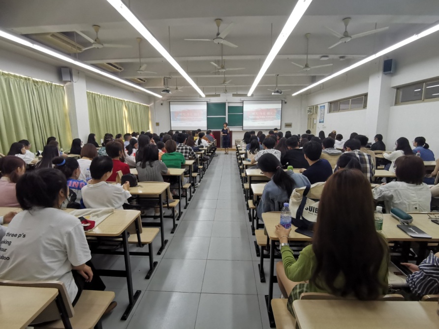 10月10日上午国际商务外语学院2019级全体新同学在学思楼B104聆听了朱龙妹老师的全英文讲座,收获满满,让同学们感受到了上海对外经贸大学教师的风采。