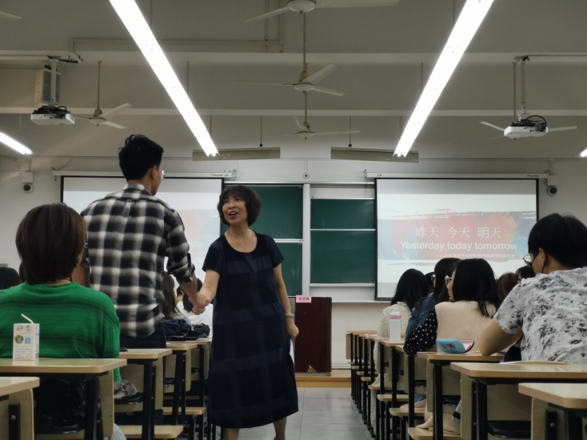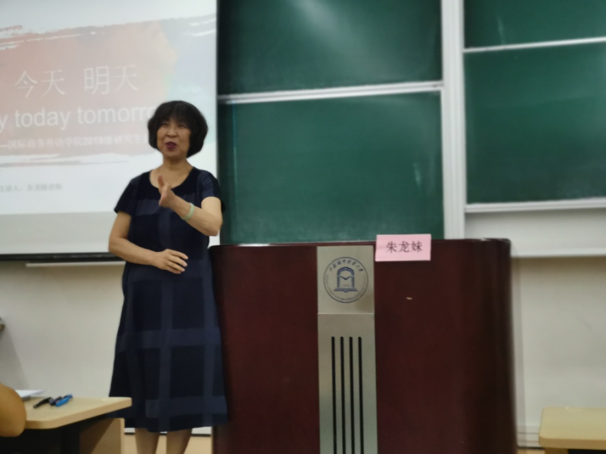 朱龙妹老师进行了一场以“昨天 今天 明天”为主题的讲座,作为外语学院2019级研究生新生的第一课。朱老师介绍了学校的基本情况,也讲述了她本人的教学工作经历。在课堂上,朱老师热情地和我们讲述了有趣的故事、人生经验、亲切和同学们互动。