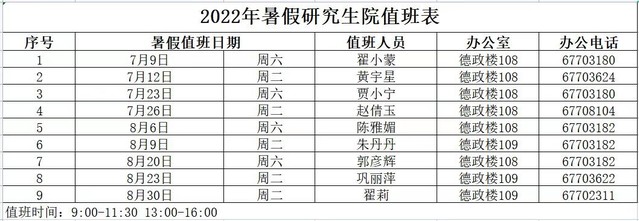 4、暑假期间请在值班时间内到相应的办公室办理,具体值班时间如下: