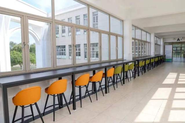 2022年暑期,资产管理处为松江校区教学楼选购、定制部分休闲桌椅。新桌椅的安装充分利用了教学楼的走廊等公共空间,丰富了教学楼的功能,方便了老师和同学们的课后生活。
