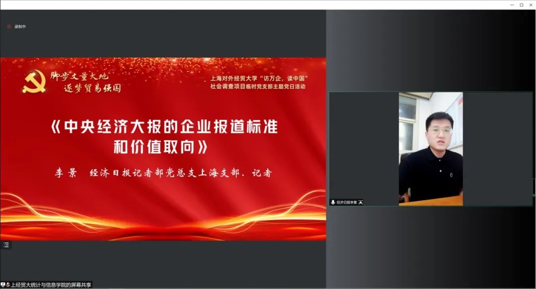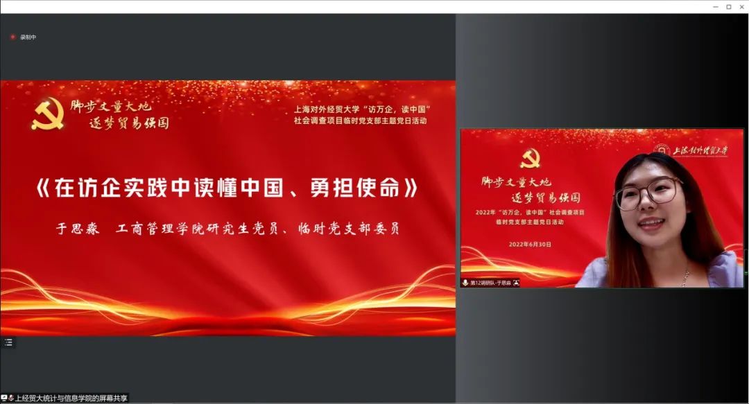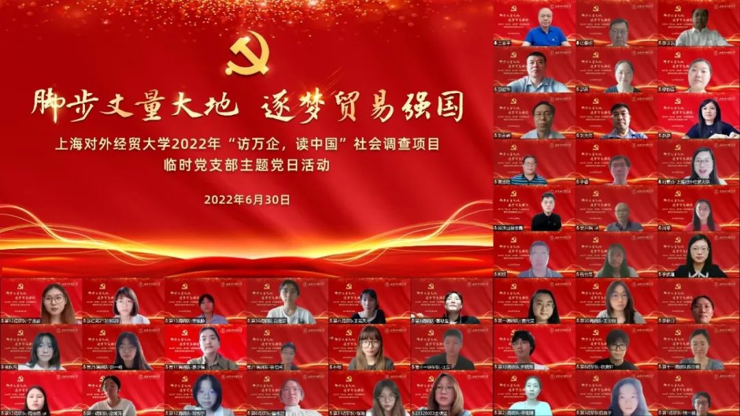 为迎接党的二十大胜利召开,深入学习贯彻上海市第十二次党代会精神,在建党101周年来临之际,6月30日下午,上海对外经贸大学2022年“访万企,读中国”社会调查项目临时党支部在线开展主题党日活动,以“脚步丈量大地 逐梦贸易强国”为主题邀请校内外专家开设专题党课,激励参与调查项目的师生牢记嘱托、砥砺奋进,以党建领航助推“访万企,读中国”社会调查项目取得高质量成果。