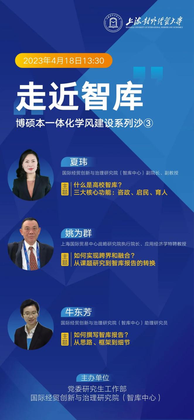 4月18日 13:30,古北校区思享家,党委研究生工作部和国际经贸创新与治理研究院(智库中心)联合推出“走近智库”师生交流会,并且邀请到了三位嘉宾一同为你揭开智库的神秘面纱。
