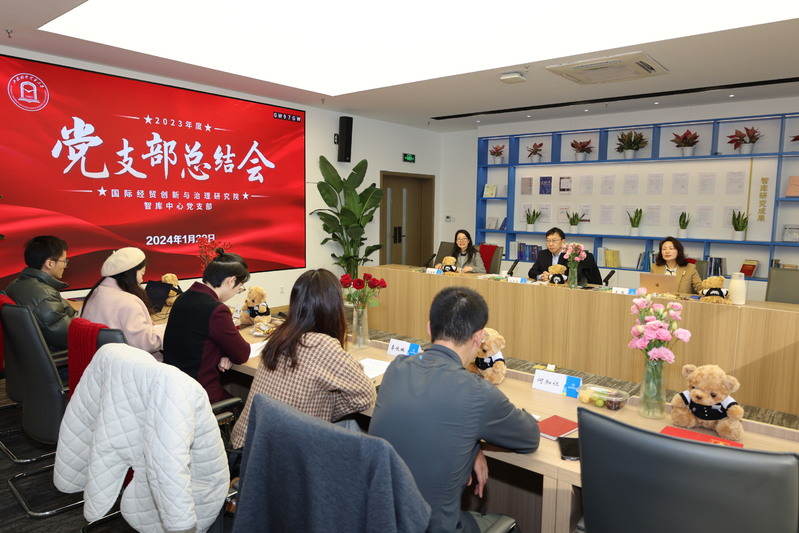 智库中心党支部书记、副院长夏玮同志从咨政科研、管理孵化、基地建设、对外交流四个方面对国际经贸创新与治理研究院2023年工作进行总结,并汇报了智库中心的党建工作。
