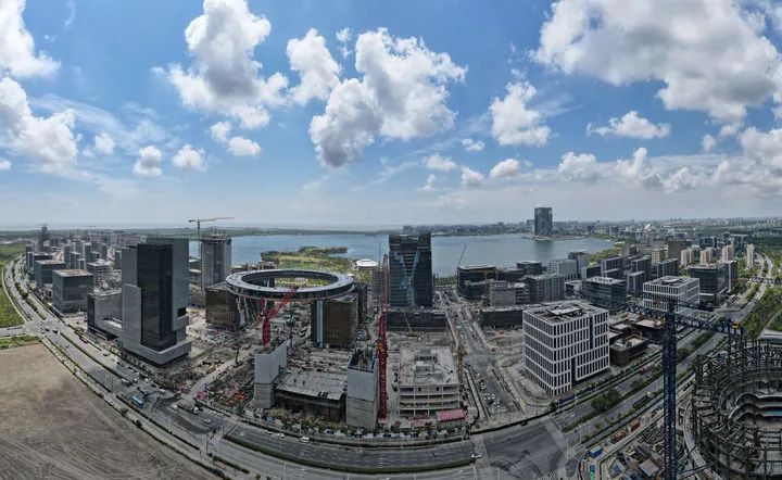 面积达5.56平方公里、正圆形的滴水湖,是临港新片区最具识别度的标志性景观。位于湖泊北岸的滴水湖金融湾,高楼林立、建设繁忙,正以肉眼可见的速度“拔节生长”。