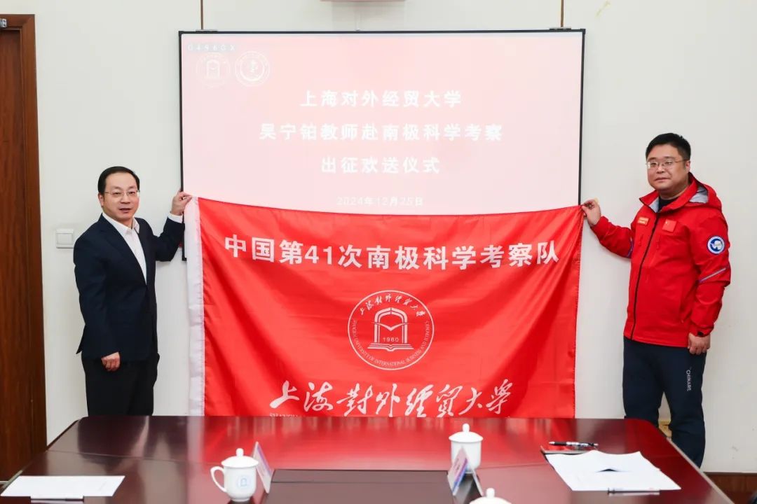 12月25日下午,中国第41次南极科学考察队上海对外经贸大学队员出征仪式在我校松江校区信息楼510会议室举行,为即将奔赴南极的我校法学院教师吴宁铂送行。校长汪荣明,校党委副书记吴毅出席,相关职能部门负责人、法学院班子成员和师生代表参加。出征仪式由法学院党委书记乔檀主持。