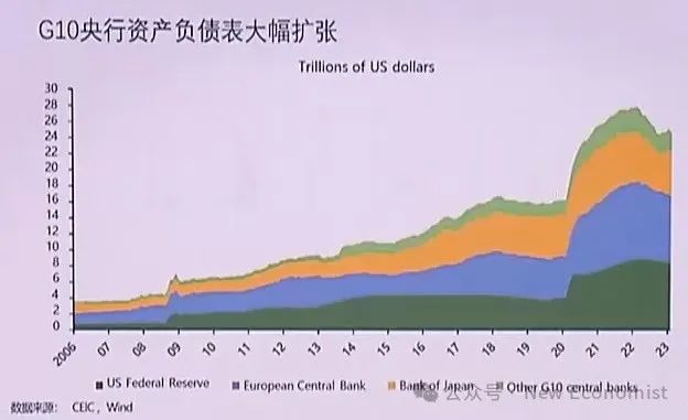 大家可以看到全球的央行资产负债表扩张是非常的厉害,现在就是高出了,就这一点,现在按照我们理论的假设,这一块都要拿掉,如果能回到这里的话,我们觉得金融会是比较安稳的,但实际上这是不可能的,因为回到这一点就是金融危机,就是经济危机。所以其实要理解像美联储现在在这个位置上,就在高位上,它是往前也不能走,往后也不能走,所以货币政策只能是走走停停,停停走走,财政持续扩张,货币停停走走,走走停停,这就是金融业最大的潜在风险,我觉得这个风险它是一个不断的积聚的风险、积累的风险。那么央行的利率水平在这个情况下要降,降不下来,所以我们做这个曲线,我们可以看到央行的利率到了水平5.5以上就逐渐往下降,但它不可能降到0,就是日本在0,它还是会维持在3左右这个水平,所以这个是回不去的,央行的利率维持在一个高的水平,通胀在3%左右,央行在3-3.5%左右,经济增长速度在2.5%左右,就是我们能看到未来的新常态,我觉得这个是一个很大的全球的新的经济金融的环境和约束,理解这一点还是很重要的。
