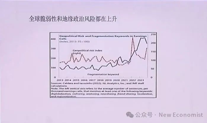 这是最新的关于不确定性的两根指数,第一个是脆弱指数,大家可以看到全球经济的脆弱指数上升得非常厉害,这个是蓝的曲线,红的曲线是地缘政治,在俄乌冲突以后有所下降,最近随着两场战争的进展急剧又在上升,所以全球的脆弱性和地缘政治的风险都上升得非常厉害。同时,全球经济的碎片化很厉害,我们统计几乎吓坏了我们自己,也包括所有人,2023年一年全球各个国家自己增加的产业政策,大家可以看到从几乎是一个极其低的,1月份的水平,100左右,涨到了1600 、1700左右,全世界产业政策。所以全球化在哪里?全球经济进一步被割裂,这是经济增长速度下滑的又一个重要的潜在影响,这个影响也是很大的。